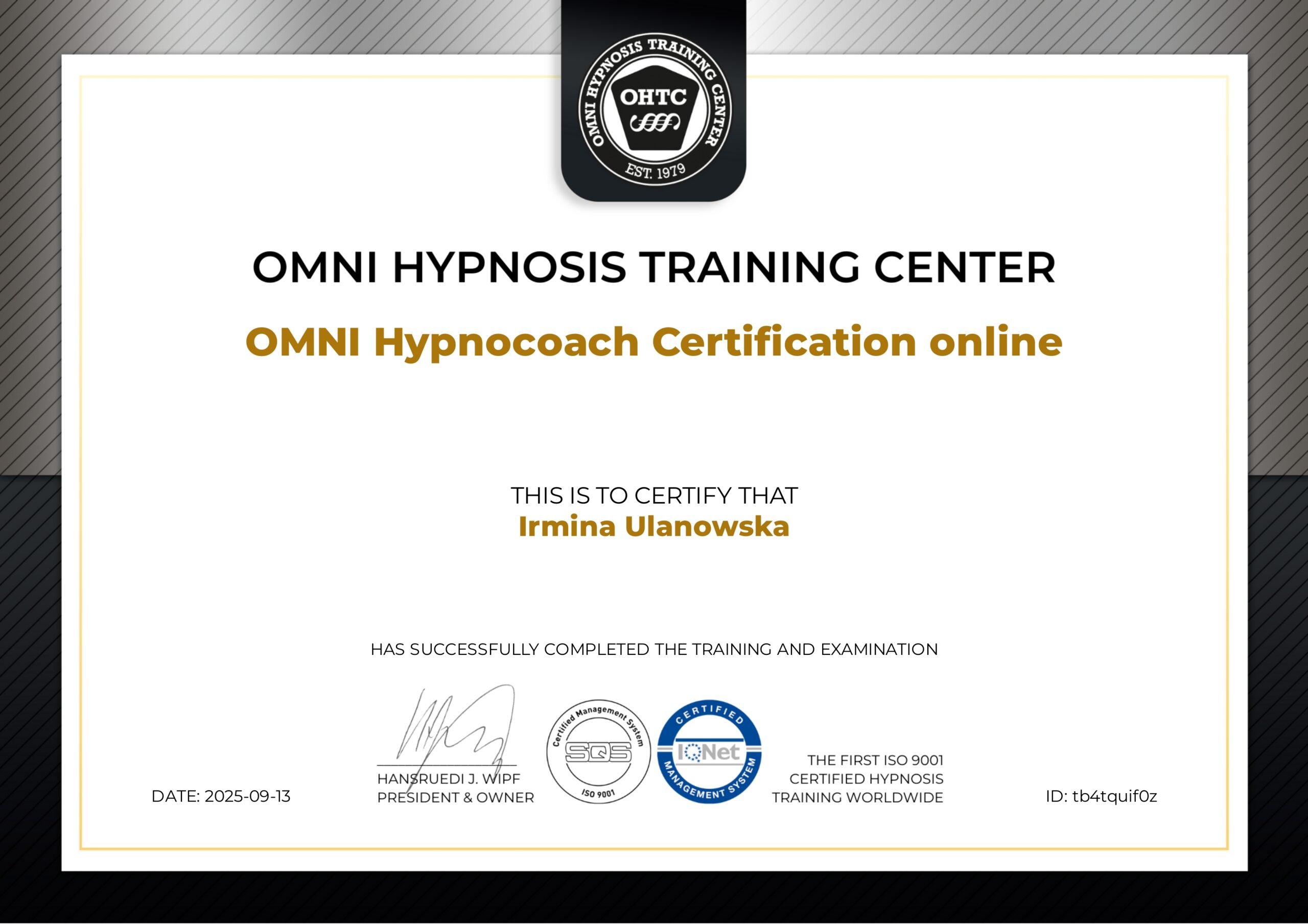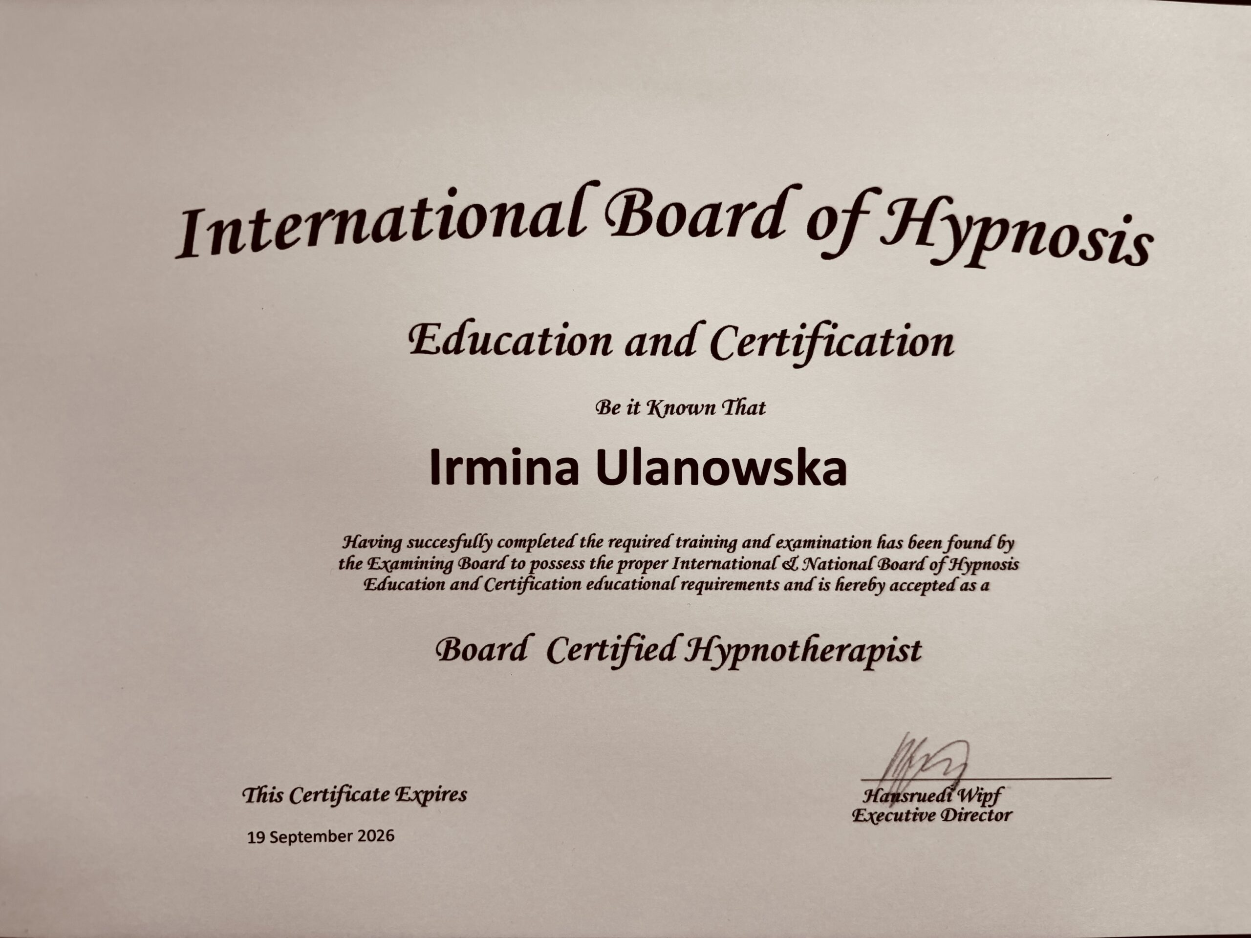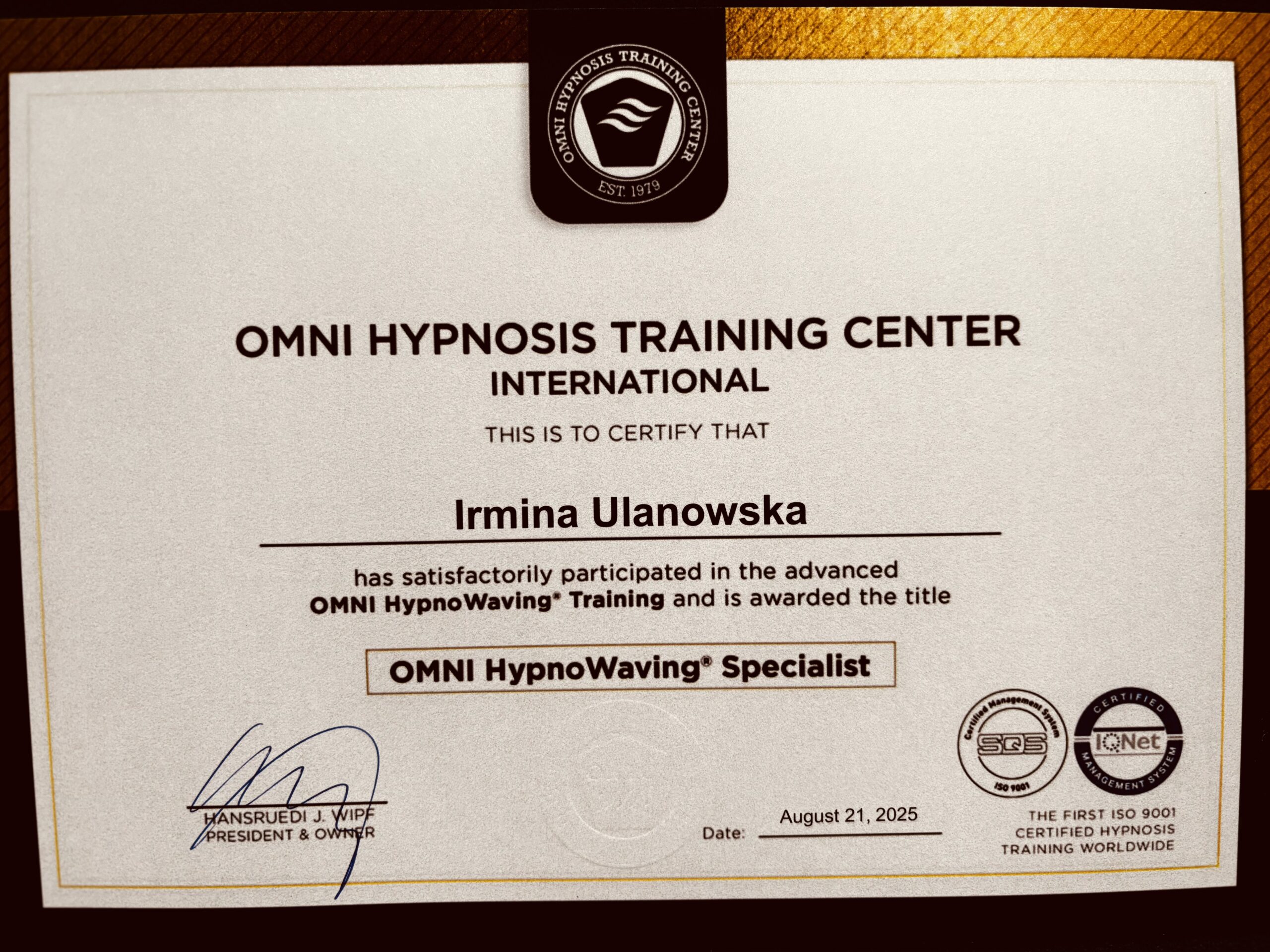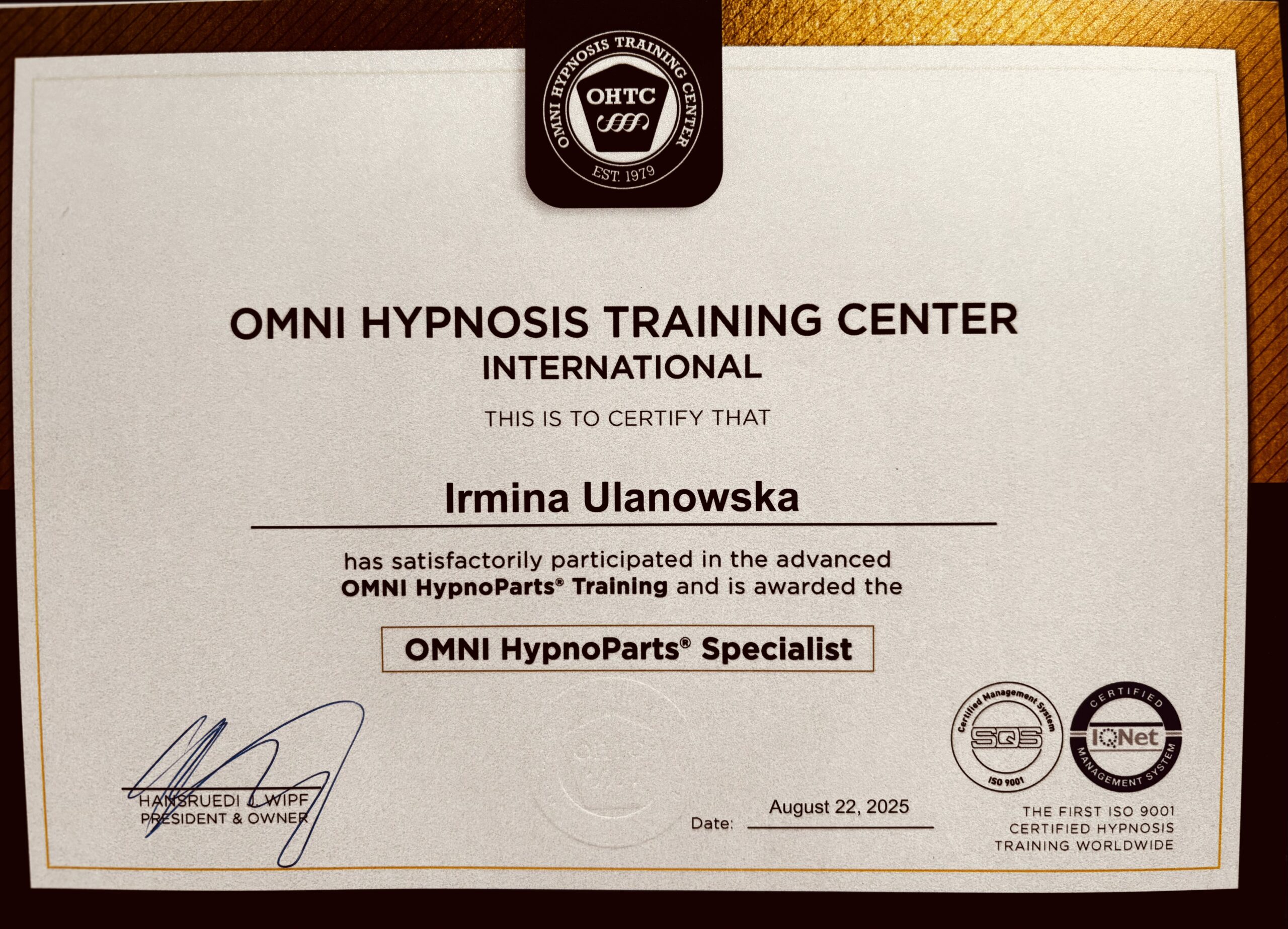 Nazywam się Irmina Ulanowska. Jestem hipnoterapeutką certyfikowaną przez OMNI Hypnosis Training Center — amerykańską szkołę uznaną na świecie, posiadającą certyfikację ISO 9001 za standardy i skuteczność w hipnozie klinicznej/hipnoterapii.