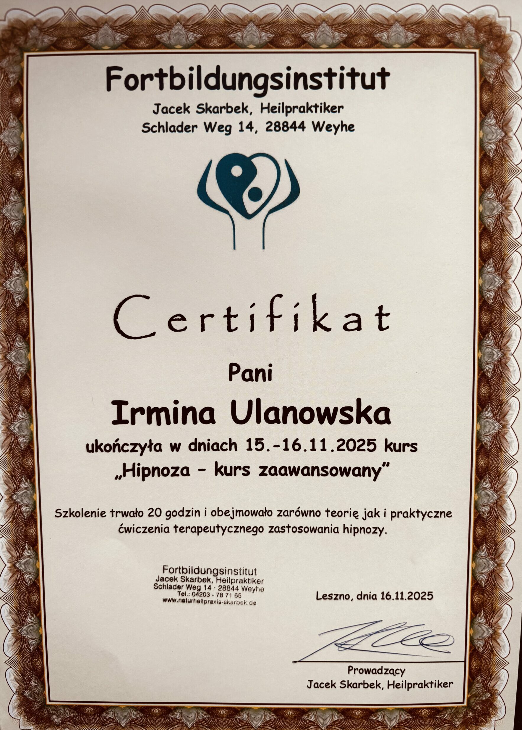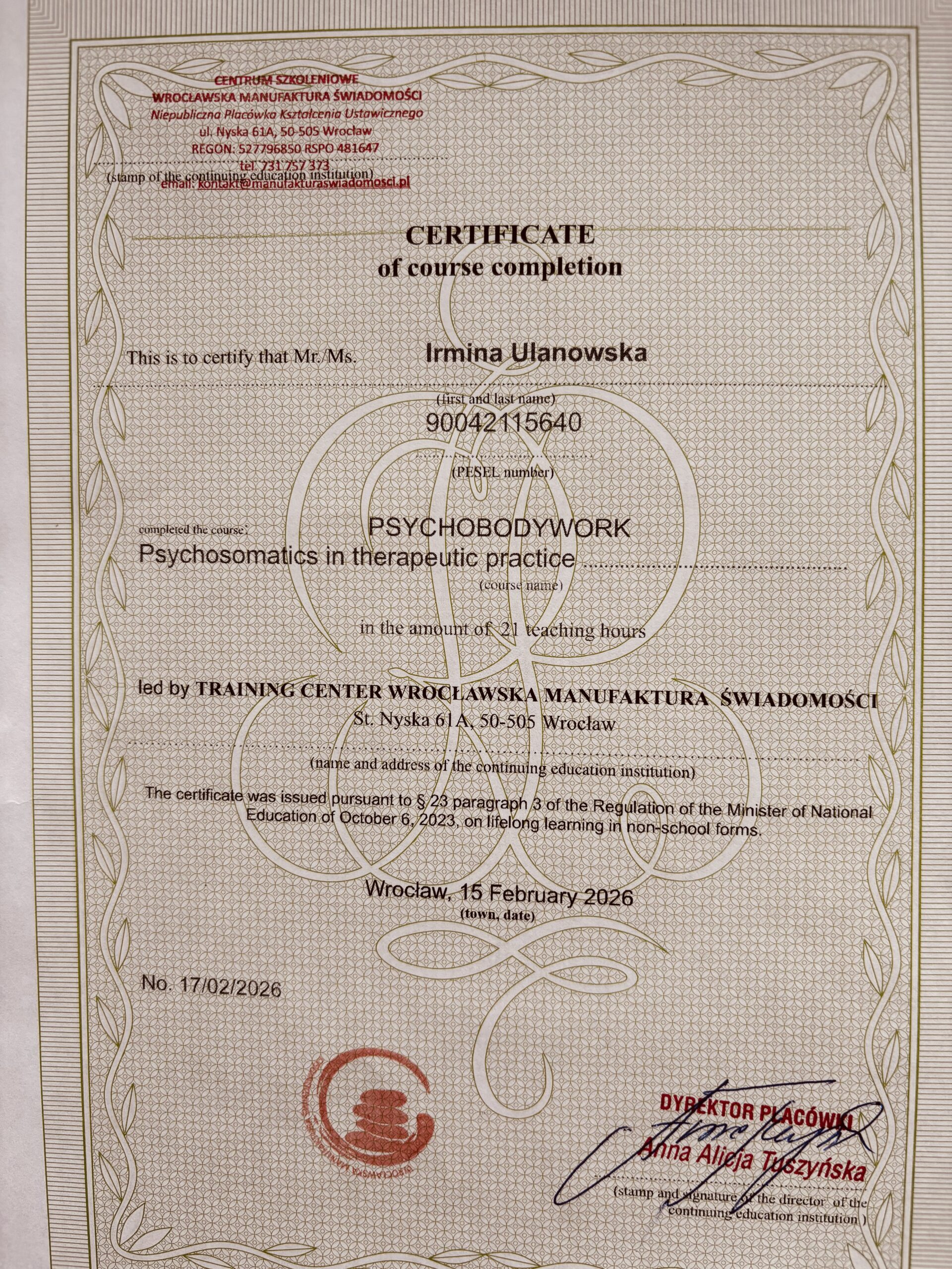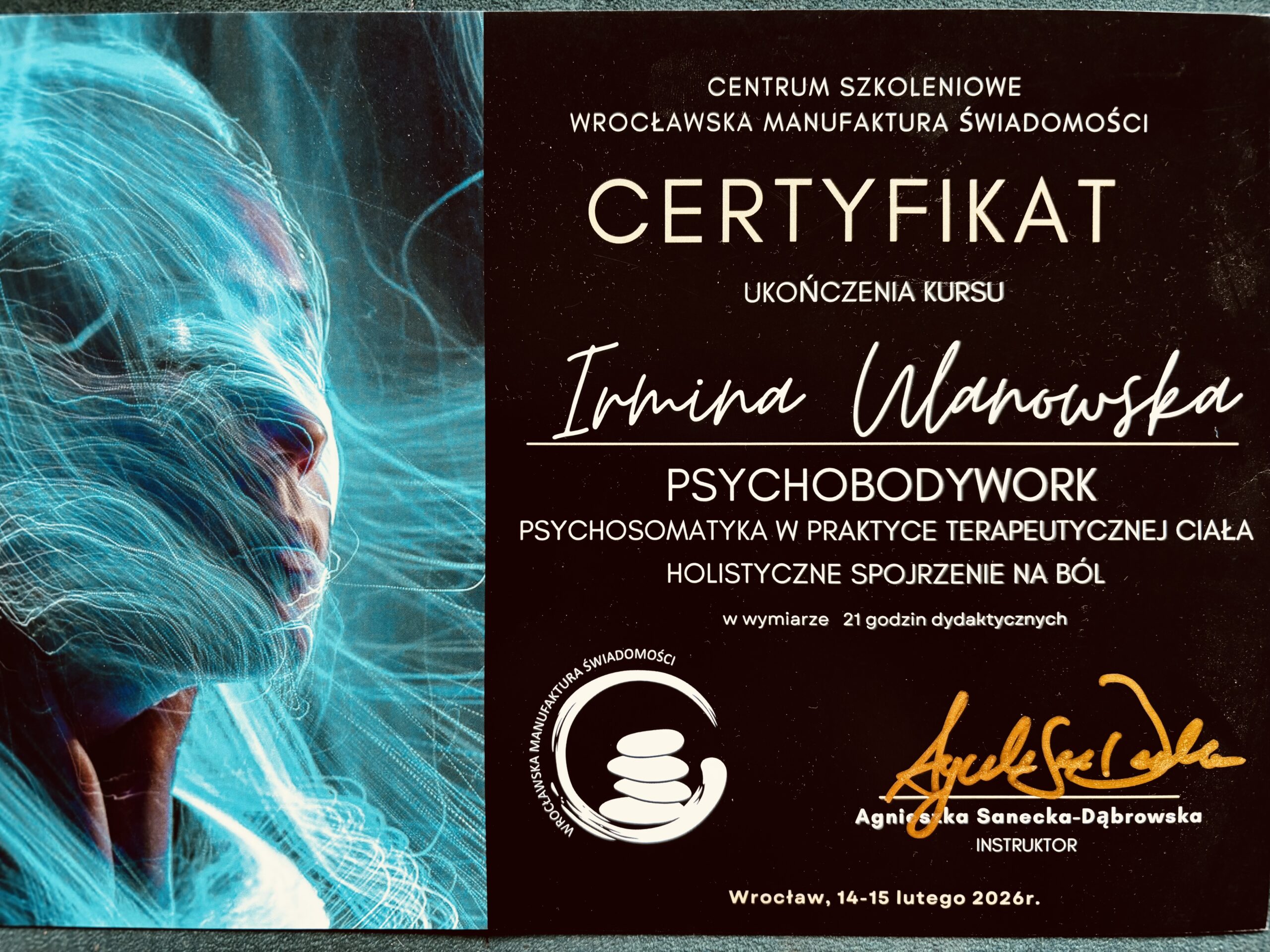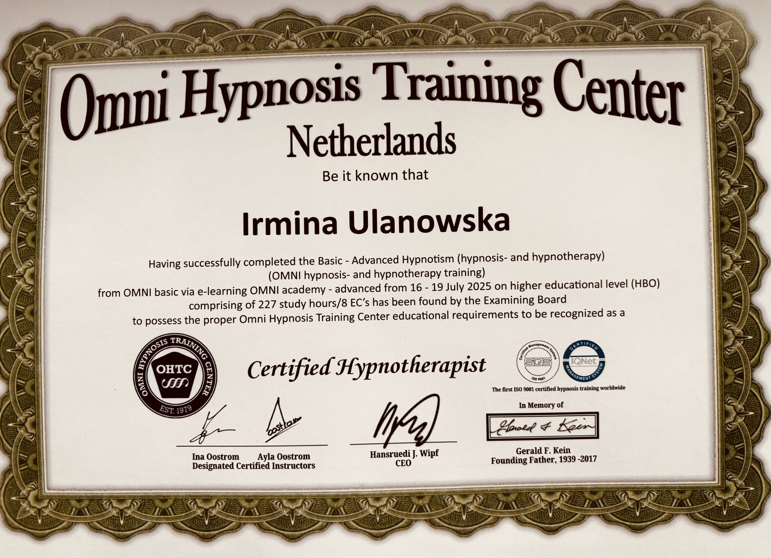 Nazywam się Irmina Ulanowska. Jestem hipnoterapeutką certyfikowaną przez OMNI Hypnosis Training Center — amerykańską szkołę uznaną na świecie, posiadającą certyfikację ISO 9001 za standardy i skuteczność w hipnozie klinicznej/hipnoterapii.